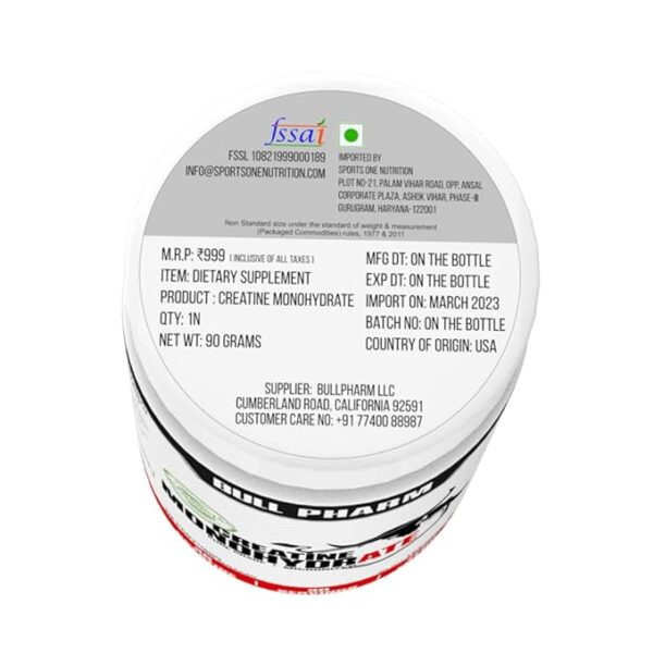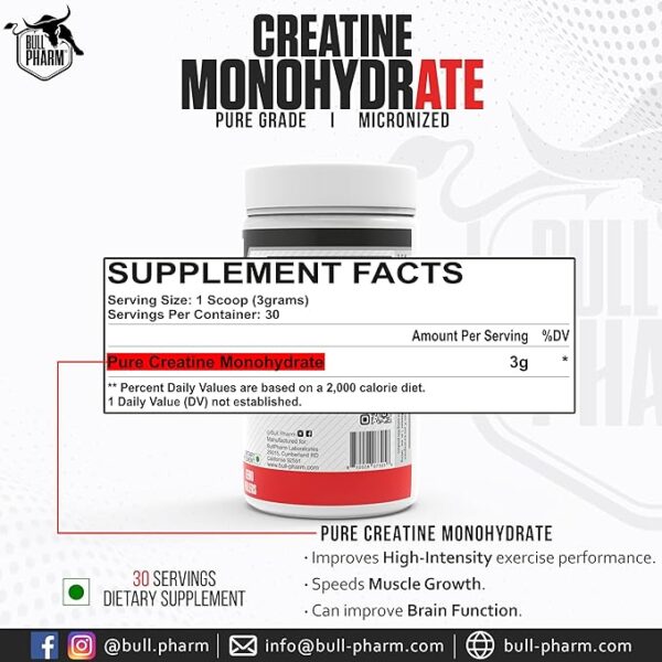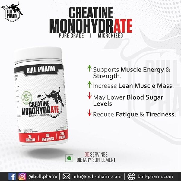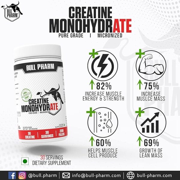 PUREST AND HIGHEST QUALITY: The most scientifically proven form available for maximum absorption. Bull Pharm Creatine Monohydrate is purity-tested, additive-free, sugar-free, GMO-free, Banned substance free and 100% Vegan. FSSAI Approved.
