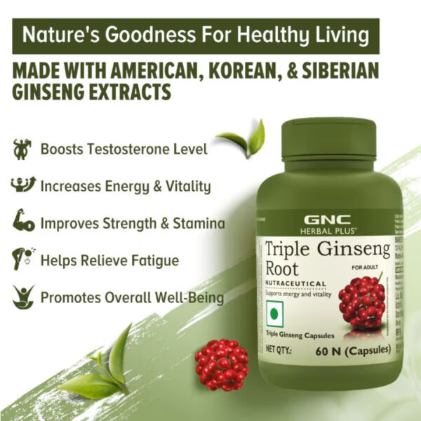 Collectively, the GNC Herbal Plus Triple Ginseng Root harnesses the synergistic effects of these three ginseng types, offering a comprehensive approach to enhancing stamina, immune function, cognitive performance, and stress management. This blend is backed by scientific research, affirming its role in promoting holistic health and well-being.
