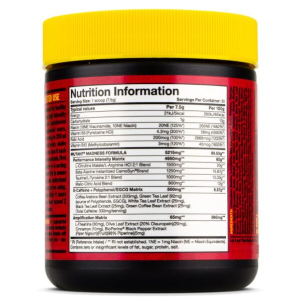 The synergy between these ingredients is what sets Mutant Madness Pre-Workout apart. The combined effects of caffeine, beta-alanine, citrulline malate, and arginine create a comprehensive energy boost, enhanced physical performance, and heightened mental focus. This formula is meticulously crafted to cater to high-intensity training needs.
