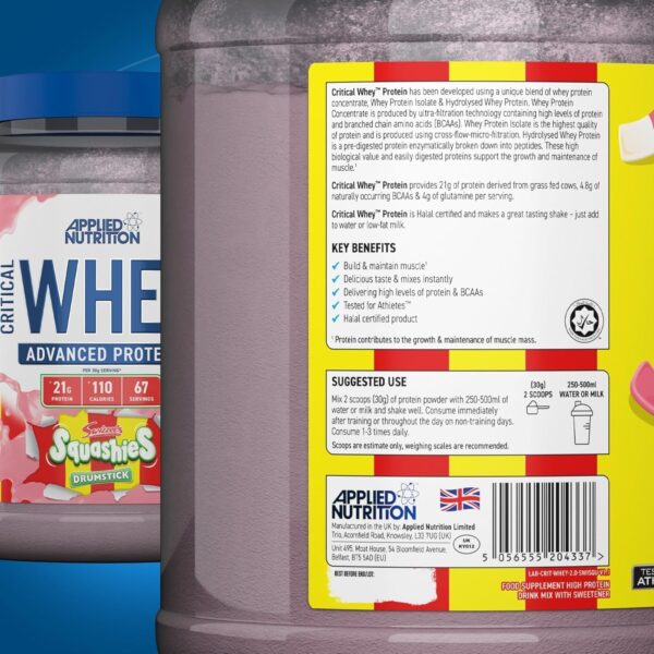 Level up your muscle-building game with Applied Nutrition Critical Whey, the ultimate premium whey protein blend! This scientifically backed formula delivers a powerful 21g of protein per serving, including naturally occurring BCAAs and glutamine, to fuel muscle growth, optimize recovery, and push you towards peak performance.