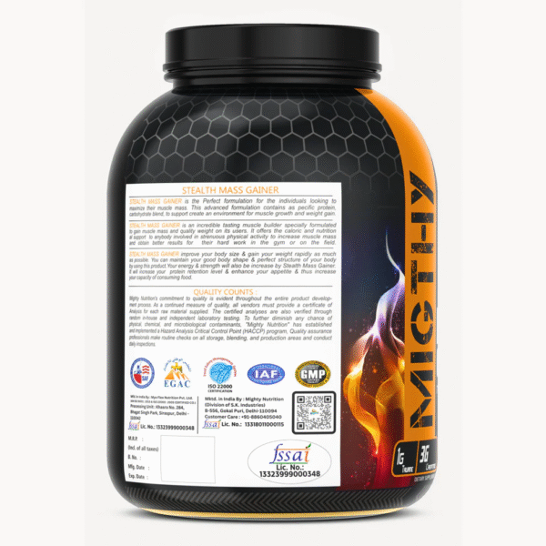 - Quality Assurance: Mighty Nutrition is dedicated to quality, ensuring each batch of Stealth Mass Gainer meets the highest standards for purity and effectiveness.