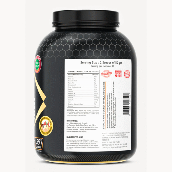 - High-Calorie Powerhouse: Stealth Mass Gainer is loaded with the essential calories your body needs to fuel intense workouts and support muscle growth.