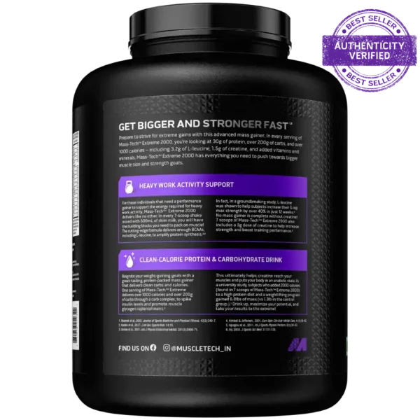 Mass-Tech™ Extreme 2000 – 3kg is an advanced mass gainer designed for athletes and bodybuilders who aim to increase muscle mass and strength. It delivers an impressive calorie count and a blend of high-quality proteins.